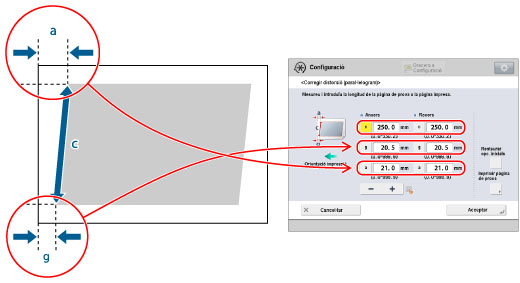 Utilitzant els dos valors numèrics següents i "c = 250,0", un dispositiu ajusta la longitud per corregir la distorsió a l'àrea d'impressió.