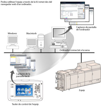 L'IU remot us permet posar treballs en pausa i reprendre'ls a la bústia de recepció en memòria o les bústies de fax confidencial i especificar diverses opcions. Us permet configurar i controlar l'equip des d'un ordinador, en lloc d'utilitzar el tauler de control de l'equip.