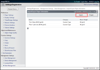 Quan rebeu informació de paper, podeu especificar si s'ha de desar tota la informació de paper rebuda o només la informació bàsica de cada tipus de paper. (Vegeu "Establiment del rang d'actualització de la informació de paper lliurada".)