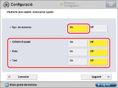 Si no voleu especificar les opcions de l'accessori per numerar jocs de còpies, premeu [Off].