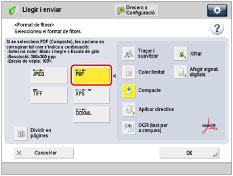 → [Llegir i enviar] → especifiqueu la destinació → premeu el botó Format de fitxer.