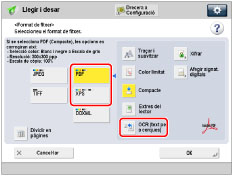 Si seleccioneu PDF o XPS com a format de fitxer, podeu establir [Compacte] i [OCR (text per a cerques)] alhora. En aquest cas, apareix [PDF (Compacte)] o [XPS (Compacte)] com a format de fitxer a la pantalla de funcions bàsiques de lectura i enviament.