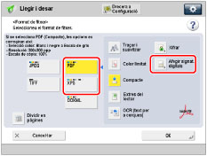 → [Llegir i enviar] → especifiqueu la destinació → premeu el botó Format de fitxer.
