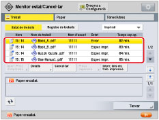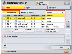 Si s'activa l'opció [Temps per a treballs suspesos] a [Opcions de funcions] (Configuració), el treball suspès perquè no hi havia paper disponible per imprimir apareixerà com a suspès quan hagi transcorregut el temps especificat. Per reprendre la impressió del treball suspès, carregueu el paper especificat → seleccioneu el treball → premeu [Detalls] → [Reprendre].