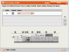 Si es produeix un encallament de paper i la impressió s'atura quan imprimiu en mode Grapar, no traieu el paper de les àrees que no siguin aquelles per a les quals s'indica que hi ha encallaments a la pantalla tàctil. Per exemple, si hi ha paper encallat a la unitat general, no traieu els fulls impresos de la unitat d'acabat on no hi encallaments de paper. (Les operacions d'impressió i de grapat es reprenen un cop eliminat l'encallament de paper a la unitat principal).