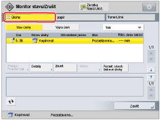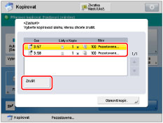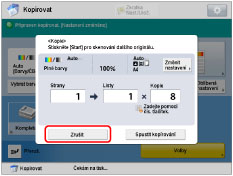 Stisknutím [Zrušit] na překryvné obrazovce, která je zobrazena během kopírování nebo čekání úlohy na kopírování, můžete zrušit kopírovanou úlohu nebo poslední úlohu, pro niž jste naskenovali originál a která čeká na kopírování.