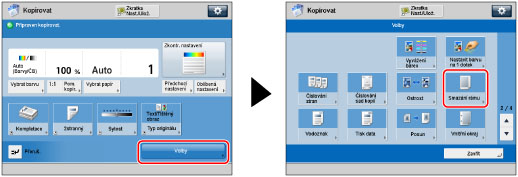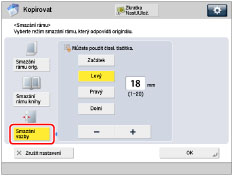 Tento režim umožňuje mazat stíny a čáry, které se objevují při kopírování různých typů originálů. K dispozici jsou tři typy smazání rámu: [Smazání rámu orig.], [Smazání rámu knihy] a [Smazání vazby].