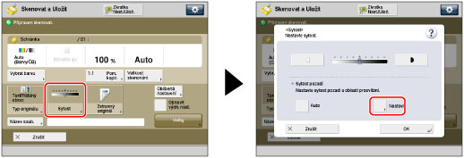 Nastavíte-li sytost pozadí stisknutím [Nastavit] pro <Sytost pozadí>, nastavení [Auto] se zruší. Podobně, stisknete-li [Auto] při provádění ručních úprav nastavení v [Nastavit], vaše úpravy nastavení se zruší. Stroj sytost nastaví automaticky podle pozadí.
