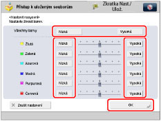 Stisknutím [Nízká] nebo [Vysoká] nastavte úroveň nasycení vybrané barvy nebo všech barev → stiskněte [OK].