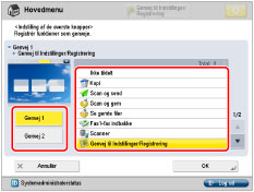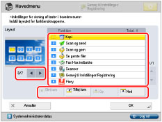 Hvis antallet af funktionsknapper overstiger antallet af knapper i det layout, der er specificeret for <Indstillinger for visning af taster i hovedmenuen>, vises de overskydende knapper på side 2 på hovedmenuskærmen. Der kan højst vises 16 knapper på hovedmenuskærmen.