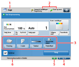 Forløbene af job- og kopifunktionerne og status på enheder og forbrugsstoffer bliver vist her. Og hvis Administration af afdelings-ID er valgt, vises det afdelings-ID, der er anvendt ved indlogning på maskinen.