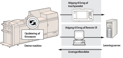 Du kan opdatere maskinens firmware til den nyeste version med "Registrér/Opdatér software". Du kan anvende denne funktion både fra touchpanelet og fra computeren (Remote UI).