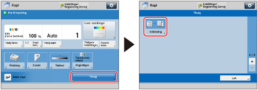 For at fremføre papir fra Document Insertion Unit-N1 skal du vælge [Arkindsætter 1] eller [Arkindsætter 2]. Hvis papiret til det aktuelle job fremføres fra Document Insertion Unit-N1, skal du trykke på [Ændr Isat1 ark.] eller [Ændr Isat2 ark.] for at vælge papir til arkindsætningerne.