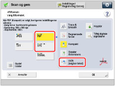 Vælger du PDF eller XPS som filformatet, kan du angive [Kompakt] og [OCR (Søgbar tekst)] samtidigt. I dette tilfælde vises [PDF (Kompakt)] eller [XPS (Kompakt)] som filformat på skærmbilledet Grundlæggende Scan og send-funktioner.