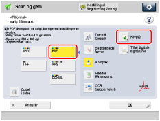 Brug denne funktion til at angive et password for print eller redigering af den scannede PDF. Vælg denne tast, hvis du vil angive indstillinger som <Tillad print>, <Tillad ændringer> og [Aktivér tilgæng., kopi. og konvert. af billeder/tekst].