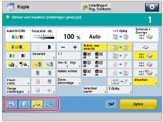 (Raadpleeg "Inschakelen van het scherm met basisfuncties voor kopiëren".)Bij [Opties] kunt u maximaal zes snelkoppelingen naar wens registreren.