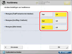 Als u op [Alles weergeven] drukt op het scherm Hoofdmenu, worden alle knoppen in de standaardvolgorde getoond, zelfs als u de lay-out van de knoppen hebt aangepast. Om terug te gaan naar het aangepaste scherm, drukt u nogmaals op [Alles weergeven].