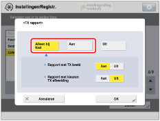 Als u een deel van het verzonden document wilt afdrukken op het Verzenden TX rapport, drukt u op [Aan] voor <Rapport met TX beeld>.