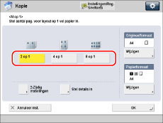 Met deze modus kunt u meerdere gescande originelen of dubbelzijdige originelen uitvoeren op één vel papier. U kunt 2, 4 of 8 gescande originelen selecteren om op de pagina te worden geplaatst. U kunt ook dubbelzijdige kopieën instellen en de layout en volgorde van de afbeeldingen wijzigen.