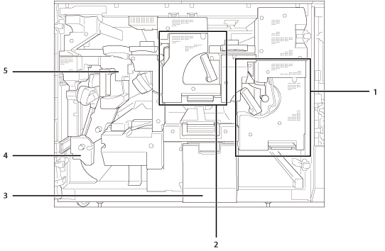 Open deze deuren om vastgelopen papier in het fixeerstation te verwijderen. (Raadpleeg "Verwijderen van vastgelopen papier".)