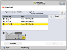 Indien tijdens het afdrukken een melding verschijnt waarin u wordt gevraagd papier bij te vullen, dan worden de resterende afdrukken automatisch gemaakt nadat u het juiste papier heeft bijgevuld. Indien u een andere papierbron selecteert, dan worden de resterende afdrukken gemaakt nadat u op [OK] heeft gedrukt.