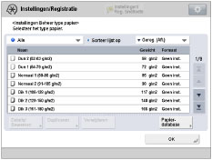 U kunt de lijst met papiertypen sorteren op datum van opslaan (Gereg. (afl.)/Gereg. (opl.)), naam (Naam (opl.)/Naam (afl.)) of basisgewicht (Gewicht (opl.)/Gewicht (afl.)) door een optie te selecteren in de keuzelijst.