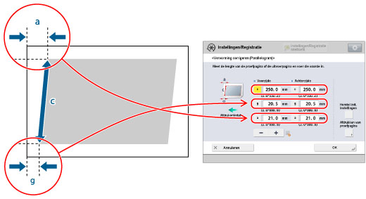 Met deze instelling kunt u de vorm van het beeld aanpassen door de lengte van de markeringen 'a' en 'g' tot de voorrand van het papier gelijk te maken wanneer het beeld de vorm heeft van een parallelogram.