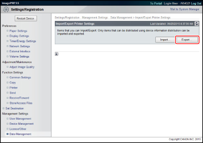 De bestandextensie voor opgeslagen apparaatinstellingen verschilt afhankelijk van het machinemodel. De instellingen die geëxporteerd kunnen worden verschillen ook afhankelijk van de bestandextensie.