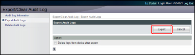 Als u [Verwijder logboeken na export van het apparaat] selecteert, selecteer dan ook [Store] nadat u op [Exporteren] hebt geklikt. Als u [Cancel] selecteert, worden de logboeken verwijderd zonder te zijn opgeslagen.