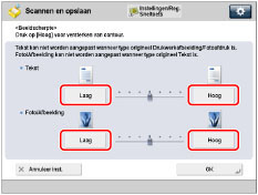 Om tekst of lijnen duidelijk te scannen, moet u een instelling gebruiken richting [Hoog] voor <Tekst>. Om originelen met drukwerkfoto's of andere grijstinten te scannen, dient u een instelling richting [Laag] te gebruiken voor <Foto/Afbeeld.>.
