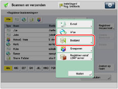 Het eerste teken dat u invoert voor de naam wordt gebruikt voor het sorteren van de lijst met bestemmingen wanneer u op toetsen drukt, zoals [ABC], [DEF], en [GHI] op het scherm Adresboek. Als op [Zoeken op naam] is gedrukt op het scherm Adresboek, verschijnt een scherm om het zoekgebied in het adresboek te verkleinen.