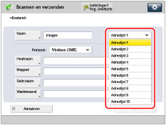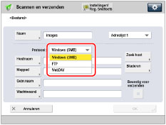 Voor meer informatie over de beschikbare protocollen raadpleegt u "Bestandserver via het toetsenbord opgeven".