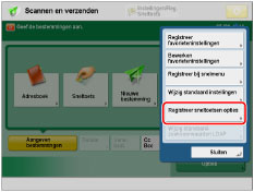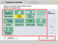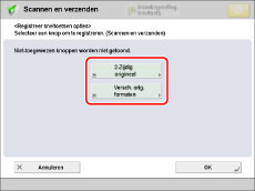 Op het scherm Scannen en verzenden worden snelkoppelingen voor twee opties weergegeven. [2-Zijdig origineel] en [Versch. orig. formaten] worden standaard weergegeven. Deze sneltoetsen kunnen worden gewijzigd in functies die u vaak gebruikt.