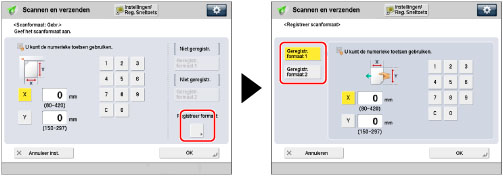 → [Scannen en verzenden] → geef de bestemming op → druk op de knop om het scanformaat te selecteren.