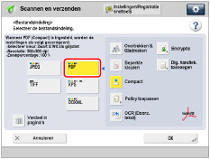 → [Scannen en verzenden] → geef de bestemming op → druk op de knop om de bestandsindeling te selecteren.