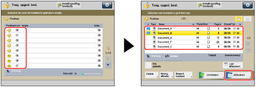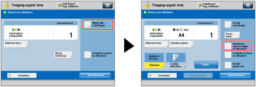 Als u de modus Bestanden samenvoegen en afdrukken gebruikt om meerdere bestanden samen te voegen en af te drukken, worden de bestanden afgedrukt met de standaardinstellingen bij Toegang opgeslagen bestanden in plaats van de individuele instellingen van de betreffende bestanden. De instellingen van elk bestand worden niet gewijzigd of gewist en blijven identiek aan die bij het aanmaken van het bestand.