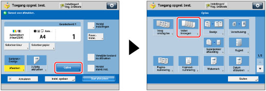 Om papier in te voeren vanuit de Document Insertion Unit-N1, selecteert u [Invoeg- module 1] of [Invoeg- module 2]. Als voor de huidige opdracht papier wordt ingevoerd uit de Document Insertion Unit-N1, drukt u op [Wijzig inv. 1 vel] of [Wijzig inv. 2 vel] om papier te selecteren voor invoegbladen.