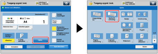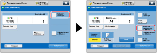 Om papier in te voeren vanuit de Document Insertion Unit-N1, selecteert u [Invoeg- module 1] of [Invoeg- module 2]. Als voor de huidige opdracht papier wordt ingevoerd uit de Document Insertion Unit-N1, drukt u op [Wijzig inv. 1 vel] of [Wijzig inv. 2 vel] om papier te selecteren voor de opdrachtscheidingsbladen.