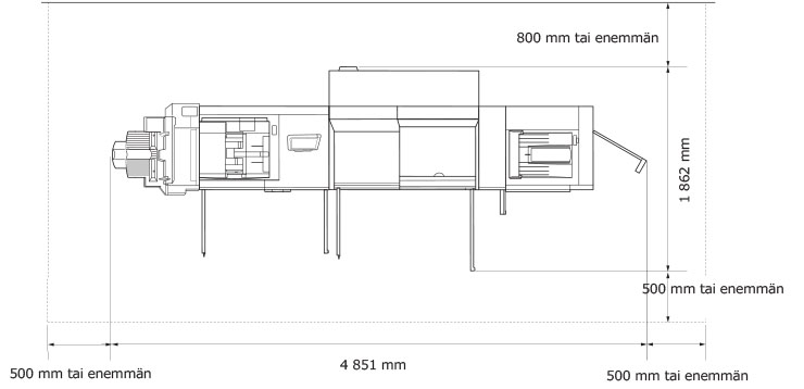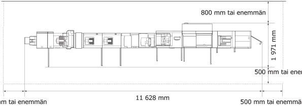 Ja kun asennat seuraavat laitteet: Kaksiteräinen vihkoleikkuri A1, Vihkoleikkuri D1, Viimeistelijä AN1, Vihkoviimeistelijä AN2, Paperintaittoyksikkö J1, Liimasidontayksikkö E1, Asiakirjan lisäysyksikkö N1, Paperinsyöttöyksikkö D1, Toinen paperinsyöttöyksikkö D1, Paperinsyöttöyksikkö Lite C1, Monitoimirei'ittäjä A1, and Keräilijä H1, kunkin laitteen väliin on jätettävä kytkentää varten 5 mm.