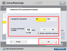 Naciśnij na [Włącz] dla <Inteligentne Skanowanie> → naciśnij na [-] lub [+] dla <Nr Pliku OCR Nazwa Znaków> aby ustalić liczbę znaków dla nazwy pliku → i naciśnij na [OK].