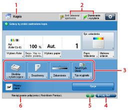 Tutaj wyświetlane są postępy w wykonywaniu zadań i operacji kopiowania, a także status urządzeń i stan zużycia materiałów eksploatacyjnych. Dodatkowo, jeżeli ustawiono Zarządzanie NI wydziału, NI wydziału wykorzystane do logowania jest wyświetlane.