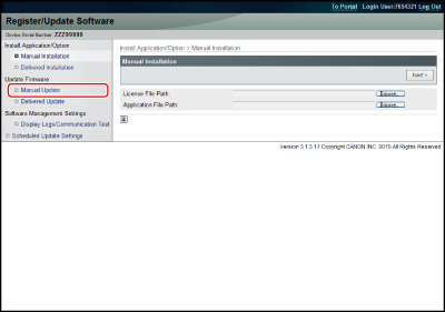 Z poziomu strony Zdalnego interfejsu użytkownika, należy nacisnąć na [Settings/Registration] → [License/Other] → [Register/Update Software].