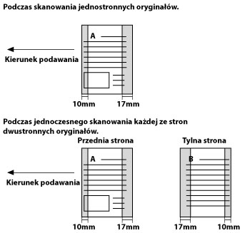 Jeżeli fragmenty kolorowe są zlokalizowane jedynie w obszarach oryginałów, tak jak ukazano za pomocą zacienionych fragmentów na ilustracji poniżej, w czasie ładowania oryginałów do podajnika.