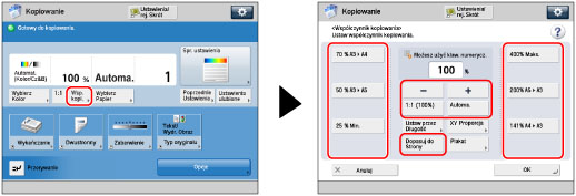 W funkcji Automatyczne zmniejszanie/powiększanie nie można kopiować bardzo przezroczystych oryginałów, np. przezroczystych folii. W takich przypadkach proszę używać jedną z funkcji Ustalone zmniejszanie/powiększanie lub Zmniejszanie/Powiększanie w %.