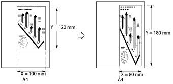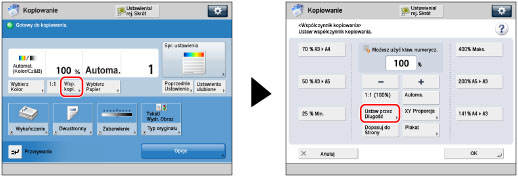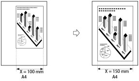 Maszyna automatycznie oblicza prawidłową proporcję kopiowania na podstawie wprowadzonych wartości. Jednakże obraz oryginału może być nieco obcięty, zależnie od formatu papieru.