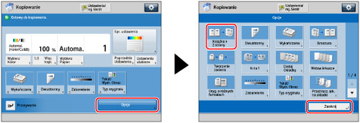 Aby wykonywać dwustronne kopie książek lub zszytych oryginałów, należy skorzystać z funkcji tryb Książka