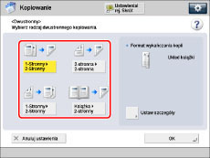 1-stronna], należy określić [Tworzenie zadania]. (Patrz „Tworzenie zadania”).Po wybraniu klawisza Przód/Tył Dwustronnie (w czasie kopiowania z wykorzystaniem trybu [Książka