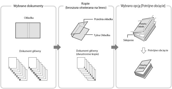 Jeżeli dla głównego dokumentu wykorzystywany jest papier o gramaturze od 80 g/m2 do 105 g/m2 i wyprowadzonych jest ponad 150 arkuszy, broszura może nie zostać wykonana z powodu swojej grubości. W takim przypadku może wystąpić zablokowanie papieru. Należy zmniejszyć liczbę stron głównego dokumentu.