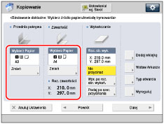 Jeżeli dla przedniej wyklejki, tylnej wyklejki lub wstawianych arkuszy zostanie ustawiony inny format papieru, formaty papieru dla innych właściwości są automatycznie zmieniane zgodnie z nowym formatem papieru. Jednakże, zmiana źródła papieru na źródło z takim samym formatem papieru nie zmieni ustawień dla innych właściwości.