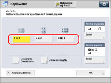 Tryb ten służy do umieszczania wielu skanowanych oryginałów lub oryginałów dwustronnych, tak aby mieściły się one na jednym arkuszu papieru. Można wybrać 2, 4 lub 8 skanowanych oryginałów i ustawić je na jednej stronie. Można również ustawić dwustronne kopie i zmienić układ i kolejność obrazów.